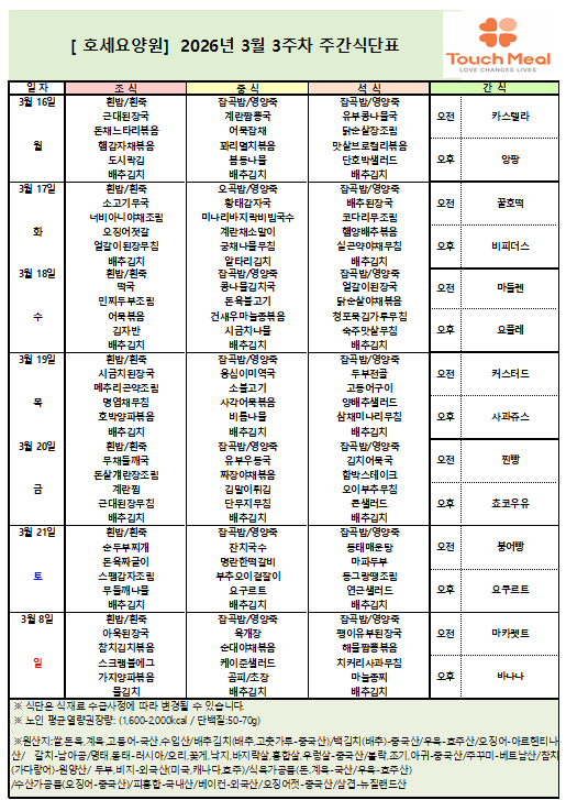 3월16일 ~ 3월22일 주간식단표페이지 정보![]() 본문3월16일 ~ 3월22일 주간식단표