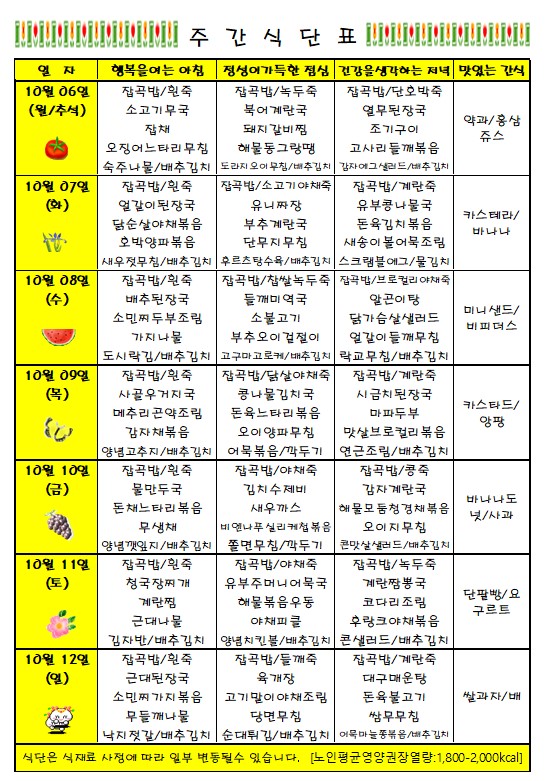 10월06일 ~ 10월12일 주간식단표페이지 정보![]() 본문10월06일 ~ 10월12일 주간식단표