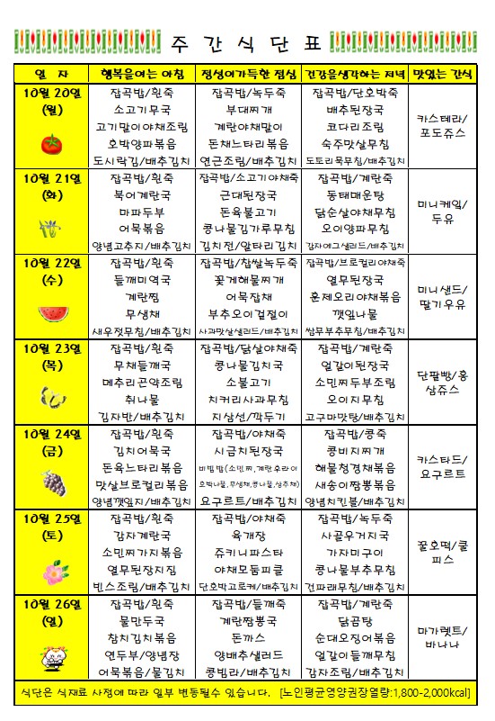 10월20일 ~ 10월26일 주간식단표페이지 정보![]() 본문10월20일 ~ 10월26일 주간식단표