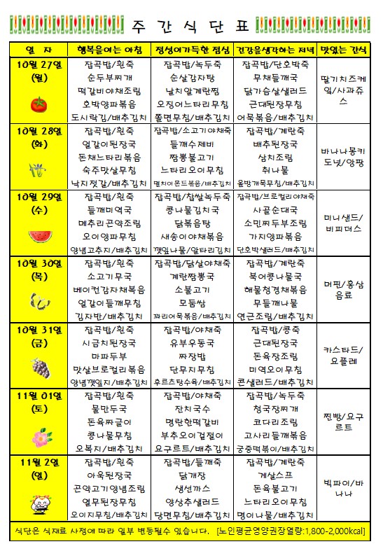 10월27일 ~ 11월02일 주간식단표페이지 정보![]() 본문10월27일 ~ 11월02일 주간식단표