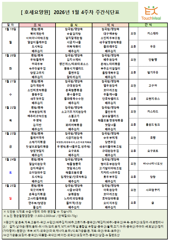 1월19일 ~ 1월25일 주간식단표페이지 정보![]() 본문1월19일 ~ 1월25일 주간식단표