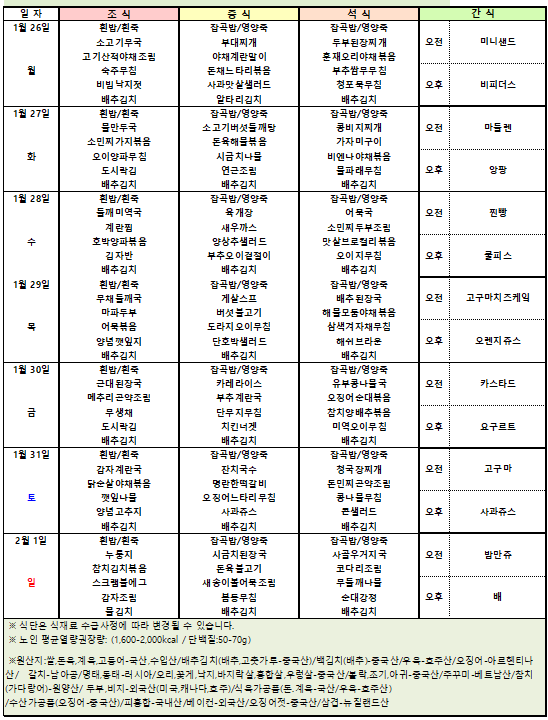 1월26일 ~ 2월1일 주간식단표페이지 정보![]() 본문1월26일 ~ 2월1일 주간식단표