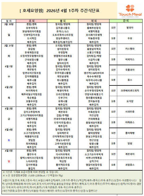 3월30일 ~ 4월5일 주간식단표페이지 정보![]() 본문3월30일 ~ 4월5일 주간식단표