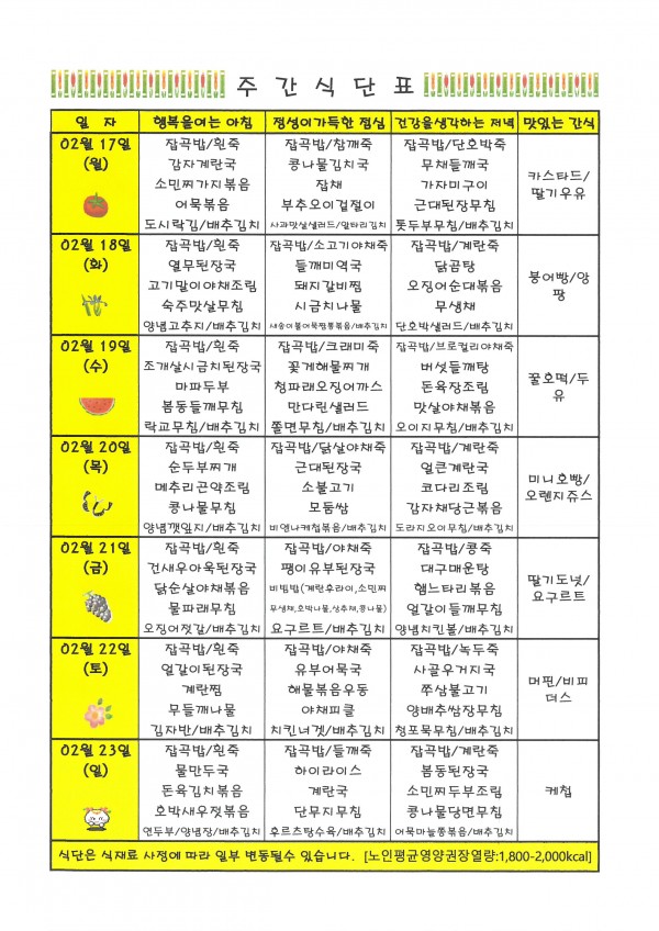 02월17일 ~ 02월23일 주간식단표페이지 정보![]() 본문02월17일 ~ 02월23일 주간식단표