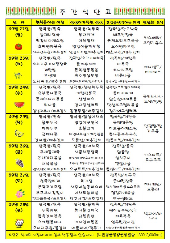 09월22일 ~ 09월28일 주간식단표페이지 정보![]() 본문09월22일 ~ 09월28일 주간식단표