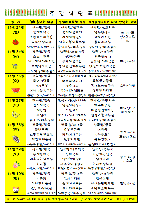 11월24일 ~ 11월30일 주간식단표페이지 정보![]() 본문11월24일 ~ 11월30일 주간식단표