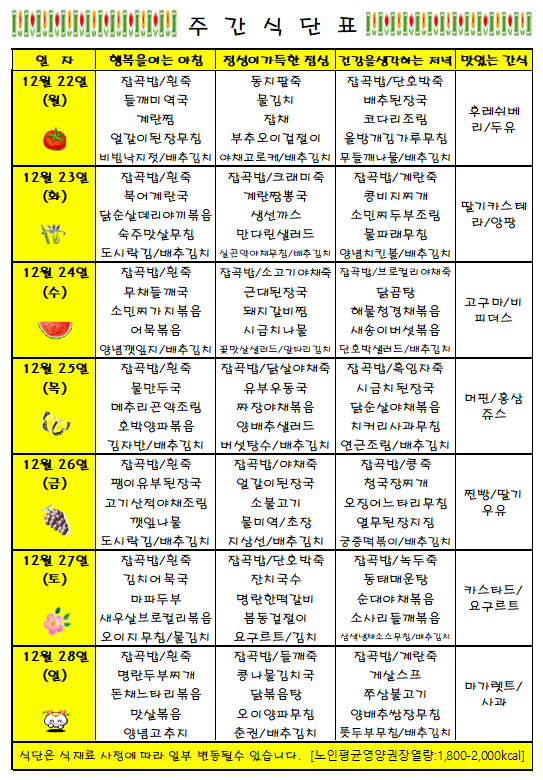 12월22일 ~ 12월28 주간식단표